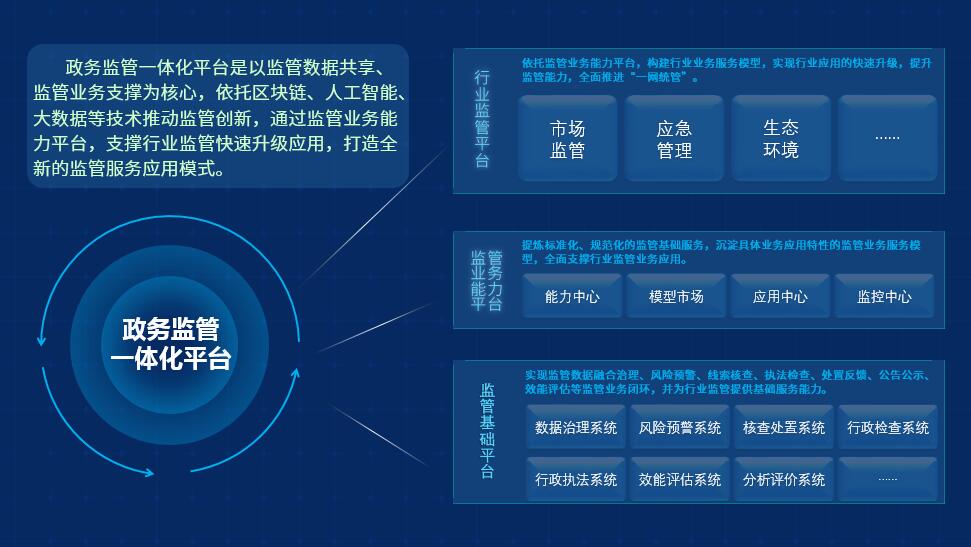 政策背景“互聯(lián)網(wǎng)+監(jiān)管”以監(jiān)管數(shù)據(jù)共享為核心,通過(guò)歸集共享各領(lǐng)域的相關(guān)數(shù)據(jù),依托互聯(lián)網(wǎng)、大數(shù)據(jù)技術(shù),運(yùn)用大數(shù)據(jù)等推動(dòng)監(jiān)管創(chuàng)新,實(shí)現(xiàn)及早發(fā)現(xiàn)防范苗頭性和跨行業(yè)跨區(qū)域風(fēng)險(xiǎn);并完善對(duì)各領(lǐng)域生產(chǎn)經(jīng)營(yíng)的事前事中事后監(jiān)管,加強(qiáng)和創(chuàng)新“雙隨機(jī)、一…